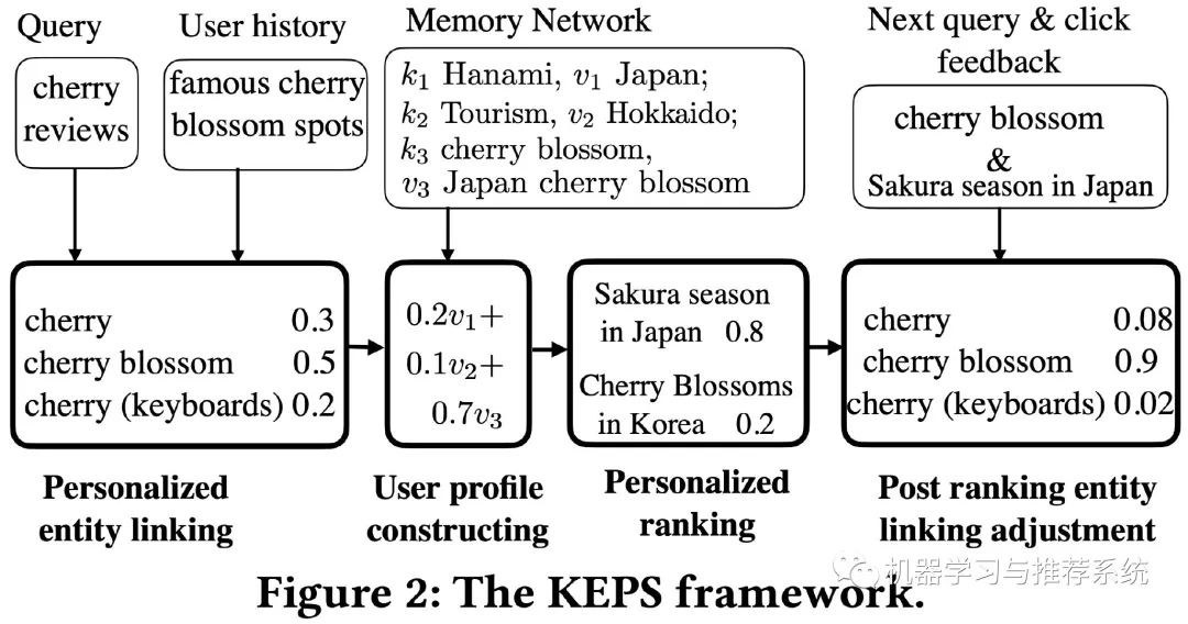 上面这幅图展示了用户输入 “cherry review” 时的一个流程,从用户的历史行为可以看到这里 cherry 这个实体指的是樱桃花。接着通过实体链接图谱,找到樱花和 Tokyo,Sakura 之间的联系,进而就可以得到一些相关的文档了。