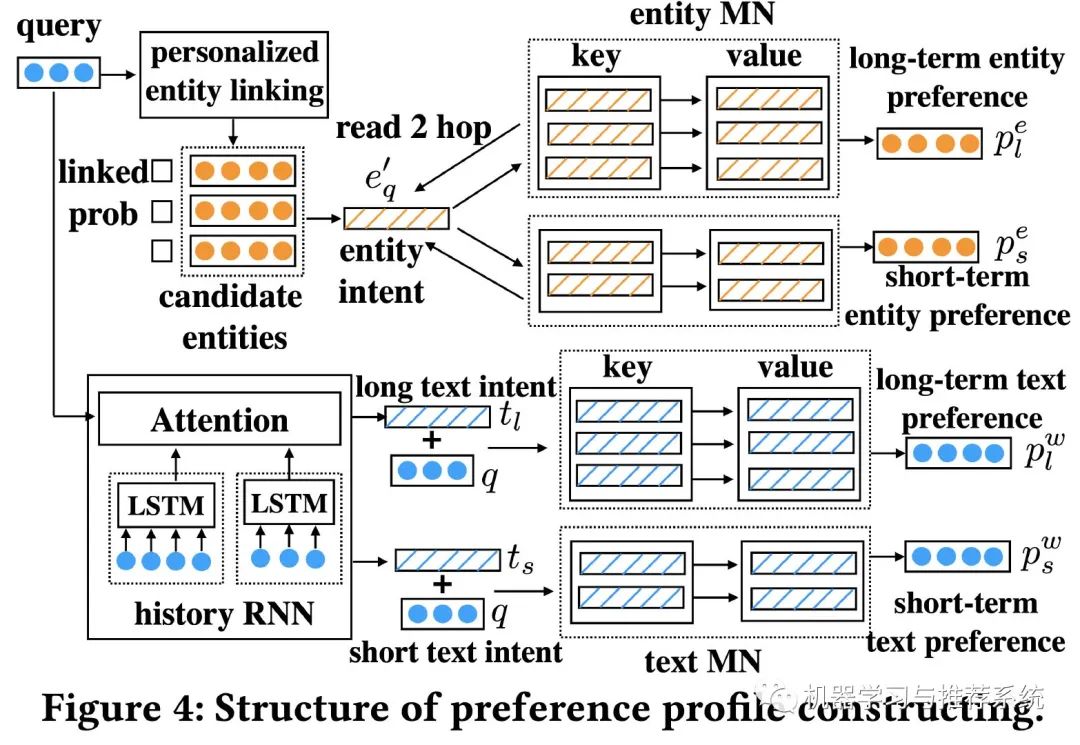 使用前面的实体链接来反映用户的搜索意图,对应的来检索用户与此意图相关的搜索历史,通过相应的文档点击历史来构建用户偏好。在本文中,使用 key-value memory network 来保存用户的历史。与第一部分类似,本文既考虑实体的历史记录,也考虑文档的历史记录。整体结构如下: