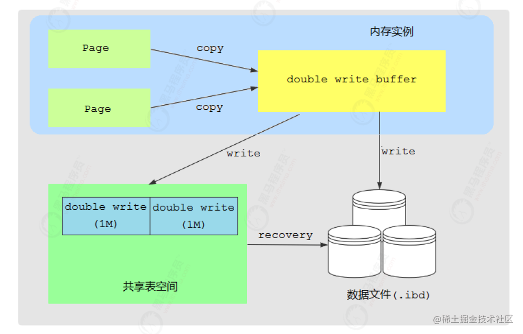 每次写物理页时,先写到double write buffer中,然后从double write buffer写到double write上去。最后再从double write buffer写到物理页上去。