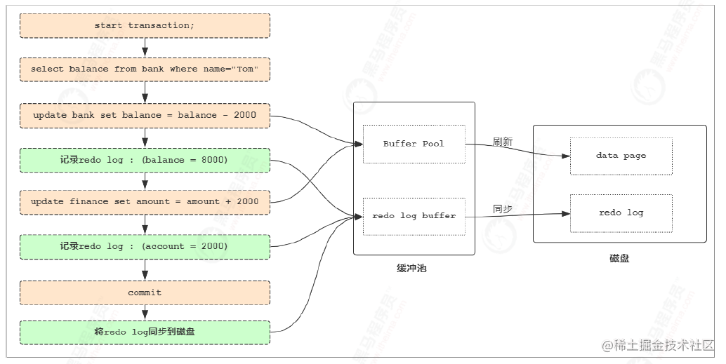 mysql 为了提升性能不会把每次的修改都实时同步到磁盘,而是会先存到Buffer Pool(缓冲池)里 头,把这个当作缓存来用。然后使用后台线程将缓存池刷新到磁盘。