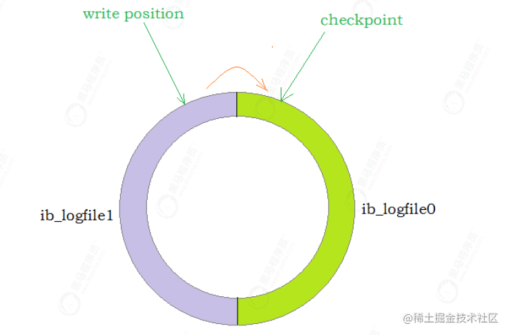write pos表示日志当前记录的位置,当ib_logfile_1写满后,会从ib_logfile_0从头开始记 录;check point表示将日志记录的修改写进磁盘,完成数据落盘,数据落盘后checkpoint会将日 志上的相关记录擦除掉,即write position ->checkpoint 之间的部分是redo log空着的部 分,用于记录新的记录,checkpoint->write position 之间是redo log待落盘的数据修改记 录。当write postion追上checkpoint时,得先停下记录,先推动checkpoint向前移动,空出位 置记录新的日志。