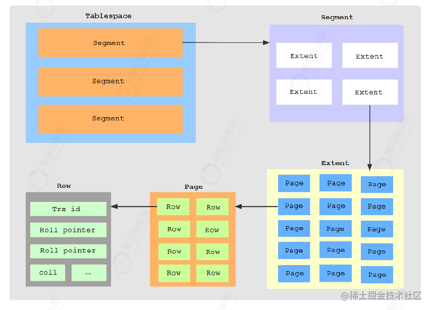 表空间是由各个段组成的,常见的段有数据段、索引段、回滚段等。InnoDB存储引擎是基于索引组织的,因此数据即是索引,索引即数据。数据段就是B+树的 叶子节点, 索引段即为B+树的非叶子节点。InnoDB中对于段的管理,都是引擎自身完成,不需要人为对其控制。