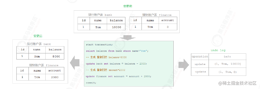 redo log叫做重做日志,是用来实现事务的持久性。该日志文件由两部分组成:重做日志缓冲(redo log buffer)以及重做日志文件(redo log),前者是在内存中,后者在磁盘中。当事务提交之后 会把所有修改信息都会存到该日志中, 用于在刷新脏页到磁盘时,发生错误时, 进行数据恢复使用。 例: