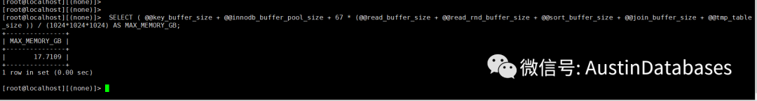 SELECT ( @@key_buffer_size + @@innodb_buffer_pool_size + 67 * (@@read_buffer_size + @@read_rnd_buffer_size + @@sort_buffer_size + @@join_buffer_size + @@tmp_table_size )) / (1024*1024*1024) AS MAX_MEMORY_GB;