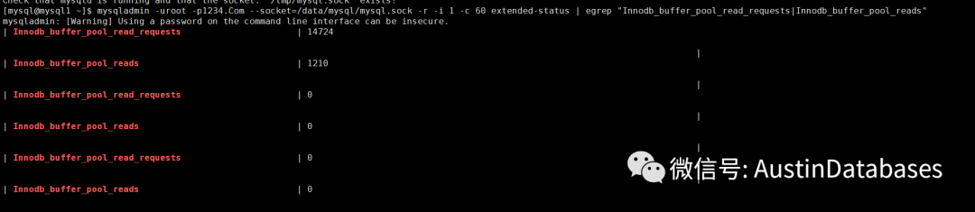 mysqladmin -r -i 1 -c 60 extended-status | egrep "Innodb_buffer_pool_read_requests|Innodb_buffer_pool_reads"