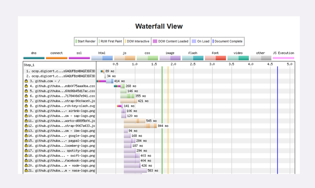 网站测试的最终结果是一个直观的“瀑布图”(Waterfall Chart),清晰地列出了页面中所有资源加载的先后顺序和时间消耗,比如下图就是对 GitHub 首页的一次测试。