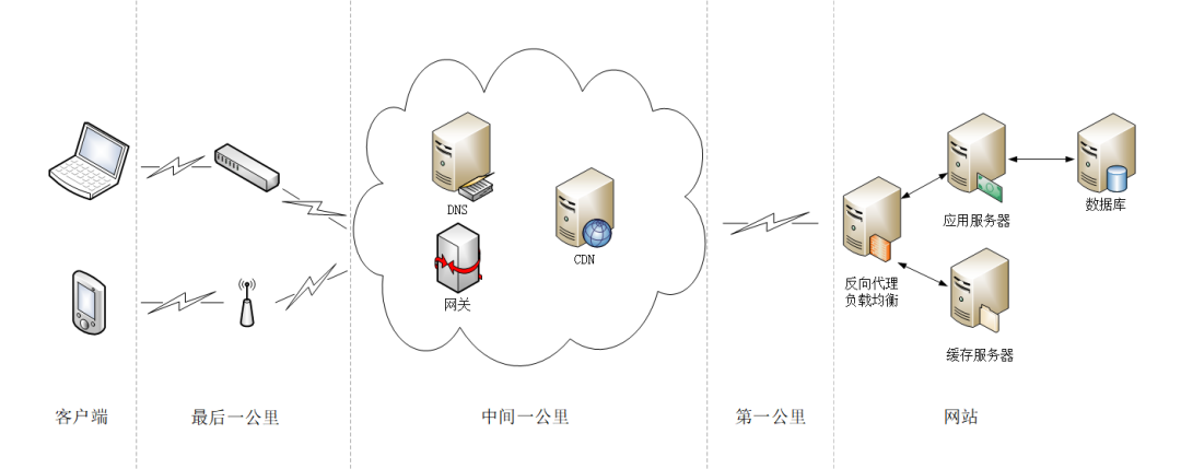 “最后一公里”是用户访问互联网的入口,对于固网用户就是光纤、网线,对于移动用户就是 WiFi、基站。以前它是客户端性能的主要瓶颈,延迟大带宽小,但随着近几年 4G 和高速宽带的普及,“最后一公里”的情况已经好了很多,不再是制约性能的主要因素了。