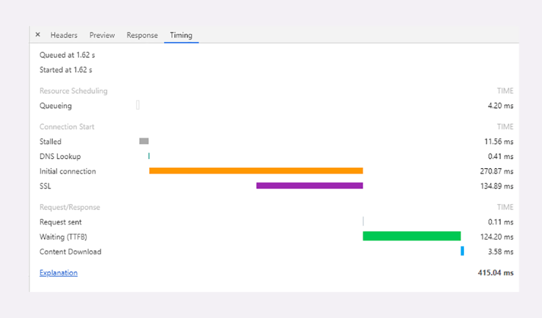 从这张图你可以看到,一次 HTTP“请求 - 响应”的过程中延迟的时间是非常惊人的,总时间 415.04 毫秒里占了差不多 99%。