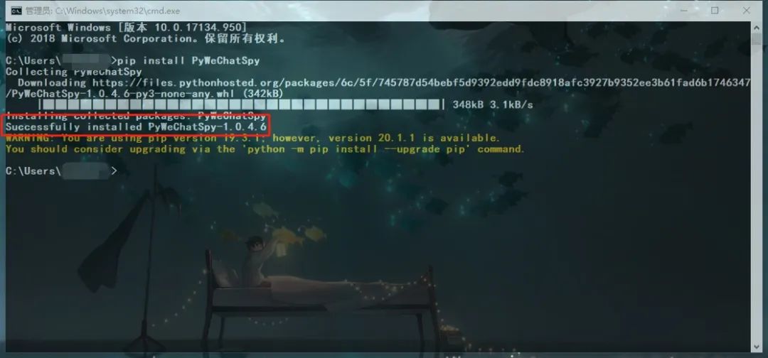 4、打开cmd 输入pip install PyWeChatSpy 回车执行