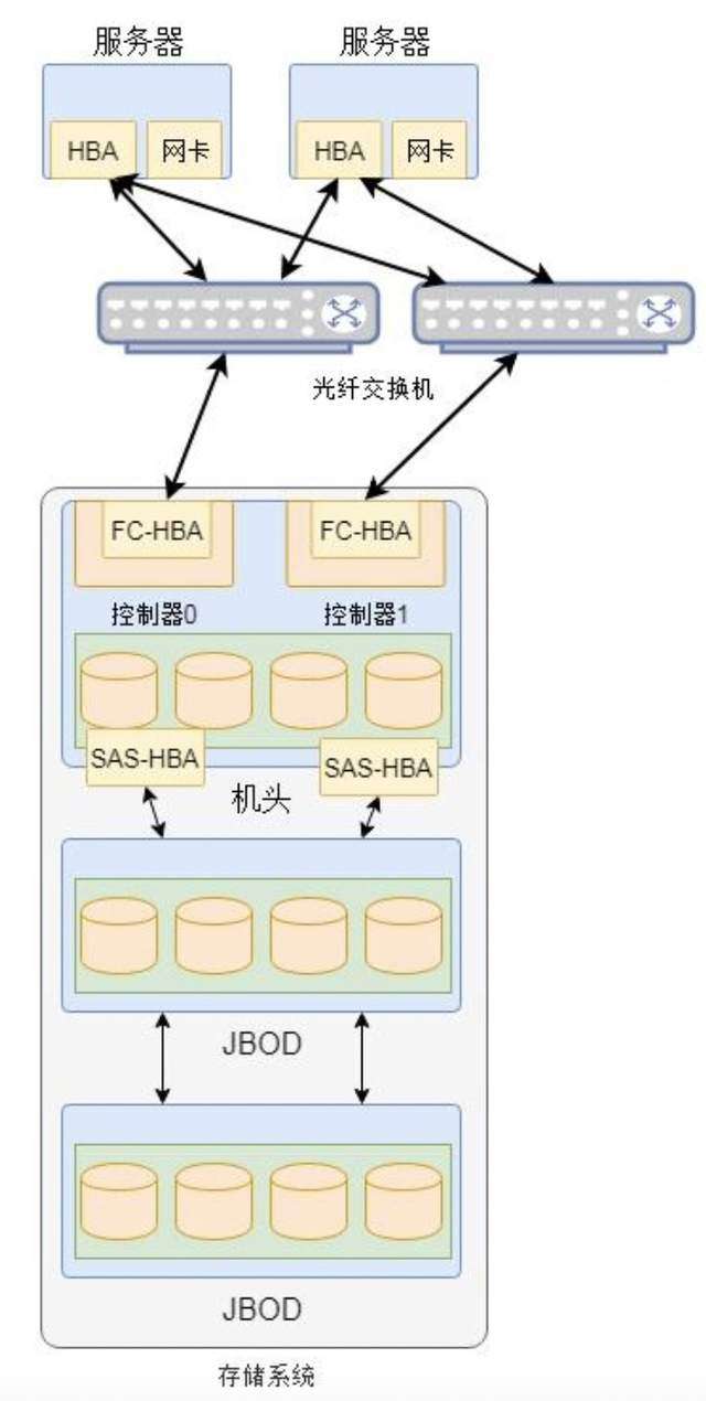 集中式存储相对与单机存储而言,存储系统中包含了更多组件,除了机头(控制器)、磁盘阵列(JBOD)和交换机等设备外,还有管理设备等辅助设备。