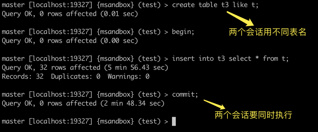 现在起两个会话,一个事务造表 t2,一个事务造表 t3,并同时提交操作,以下举例其中一个事务: