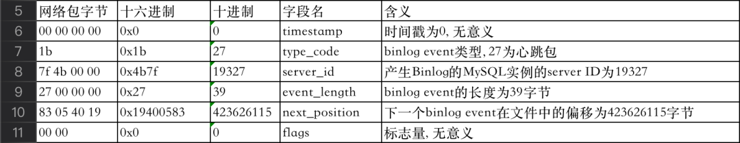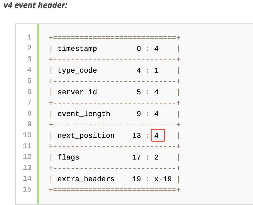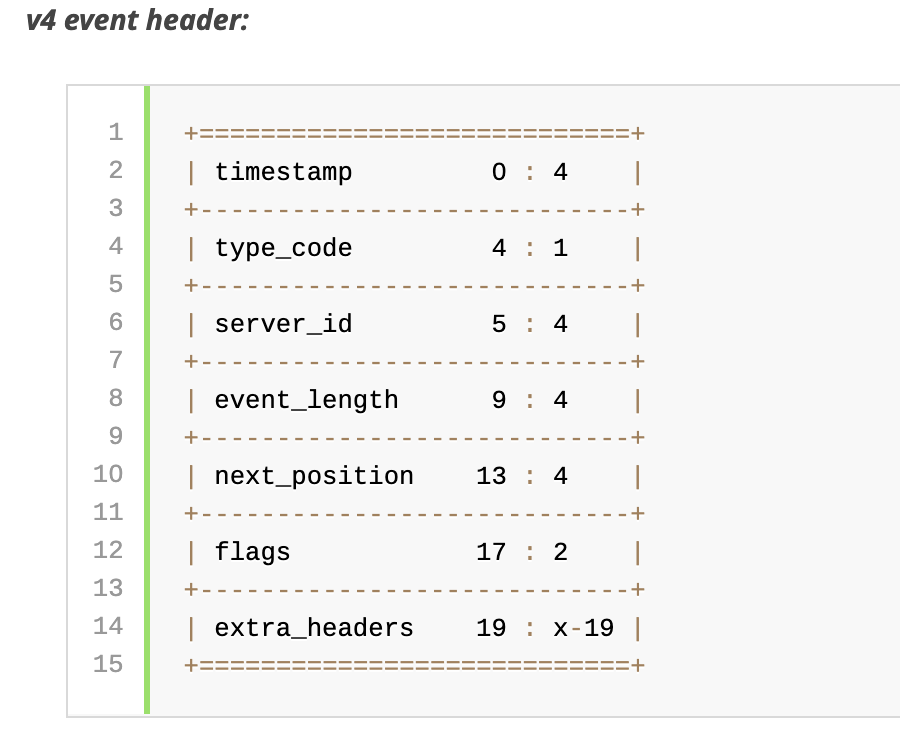 再继续阅读,https://dev.mysql.com/doc/internals/en/event-header-fields.html,了解 binlog event 的头结构如下: