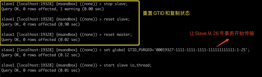 我们先重置 GTID 和复制状态,然后骗 slave 说它已经接到了 1-25 事务,要从 26 号事务开始传输,也就是从 32G binlog 的中间位置开始传输。