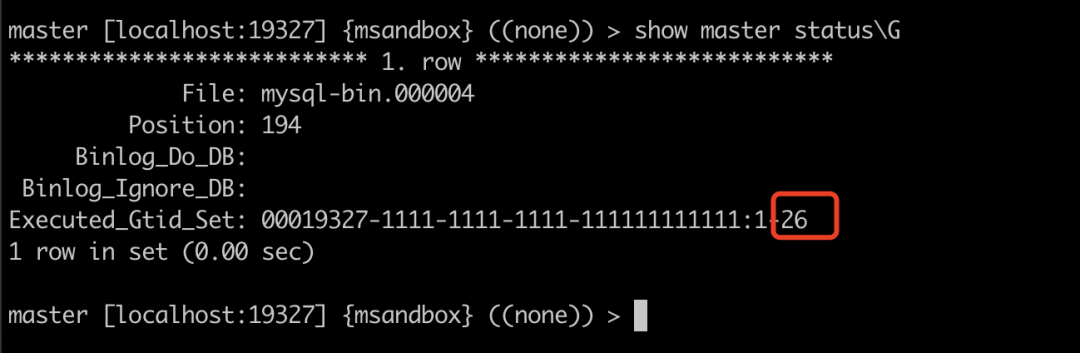 查看一下 master 上的 GTID,最后两个事务分别是 25 和 26: