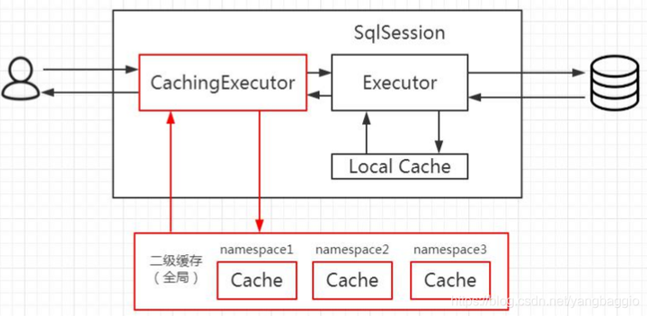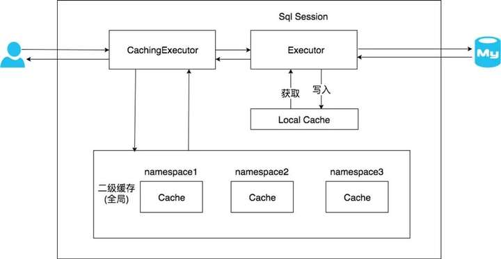 二级缓存构建在一级缓存之上,在收到查询请求时,MyBatis 首先会查询二级缓存。若二级缓存未命中,再去查询一级缓存。与一级缓存不同,二级缓存和具体的命名空间绑定,一级缓存则是和 SqlSession 绑定。