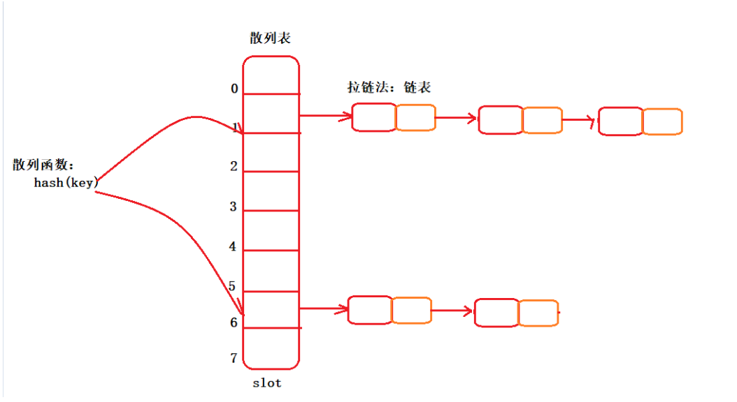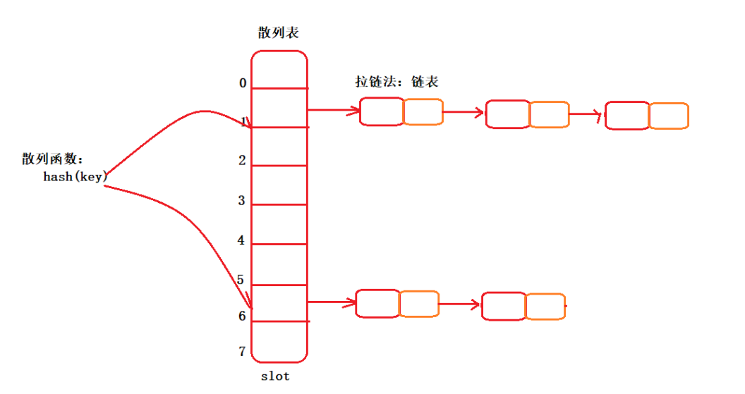 拉链法,是指当发生hash冲突后,比如说某个key,通过哈希函数hash(key),指向了数组下标5的位置。此时不巧下标5的位置已经存放了元素,即发生了hash冲突。