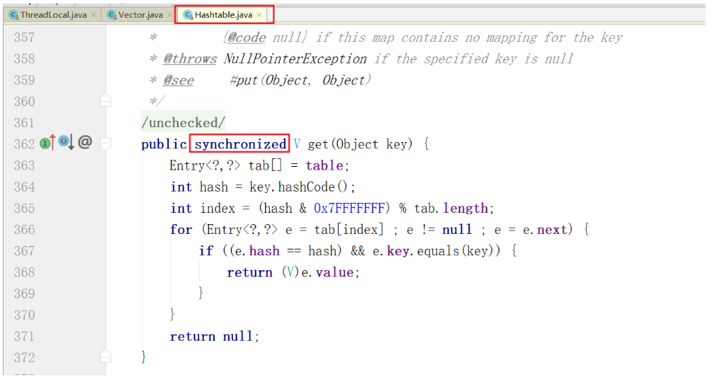 我们先回顾一下,Hashtable是如何实现线程安全的,以及它存在什么问题?你还记得吗,前面我们在高级并发编程系列十四(并发集合基础)一篇,分享了Hashtable实现线程安全的方式,它是直接在每个操作方法上加了synchronized关键字。比如下图,是我们熟悉的get方法: