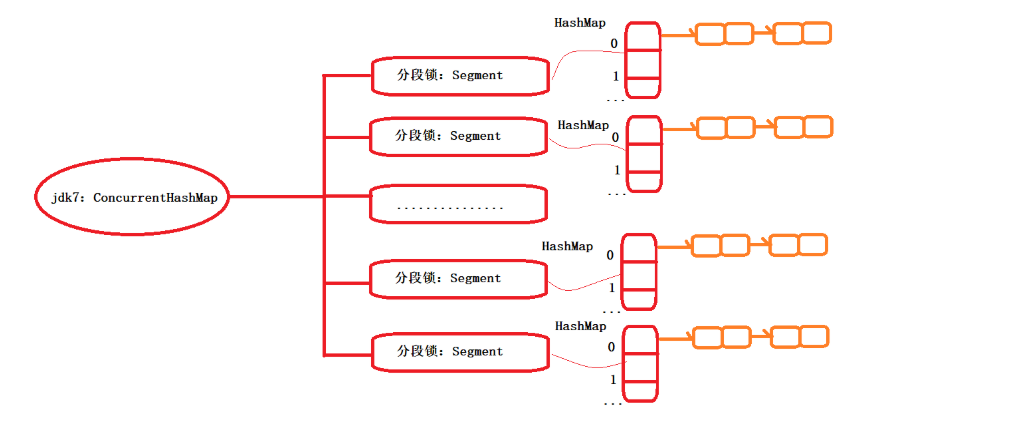 通过上图我们直观看到在jdk7中,ConcurrentHashMap它是通过分段锁实现支持高并发,默认情况下,有16个分段锁,其中每一个分段锁中,即是一个HashMap。