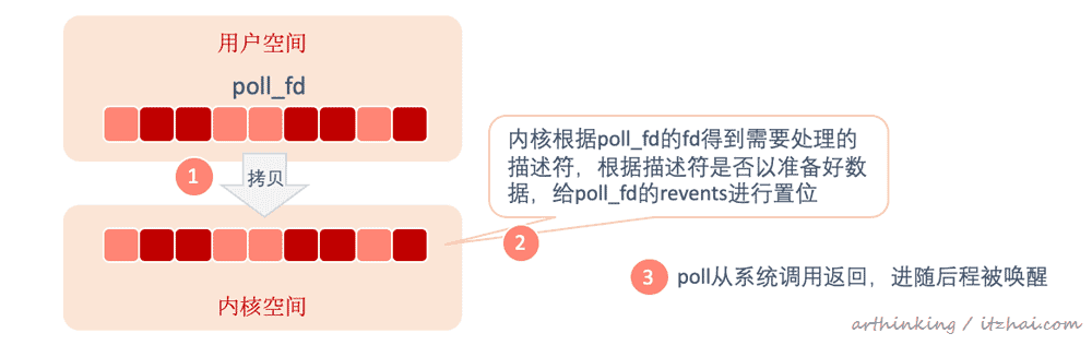 应用进程调用了poll之后,会把poll_fd从用户空间拷贝到内核空间,随后应用进程进入阻塞;