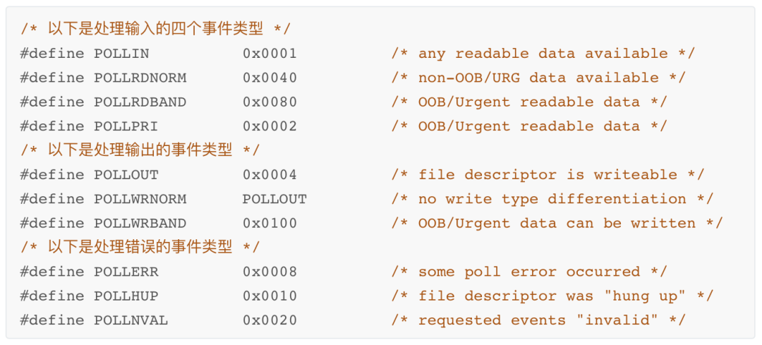 short events:为描述符上待检测的事件类型,这里用了short类型,具体的实现用二进制掩码位操作来完成,常用的事件类型如下: