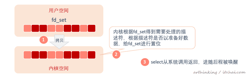 应用进程调用了select之后,会把fd_set从用户空间拷贝到内核空间,随后应用进程进入阻塞;