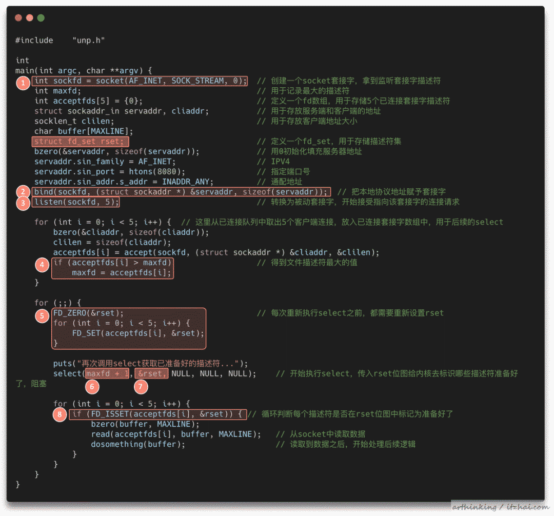这个例子开启了一个监听套接字,然后获取5个客户端连接,通过select函数判断是否有数据到达服务器端,如果有则读取,我把详细的注释都加上了,下面重点介绍标注了序号的代码: