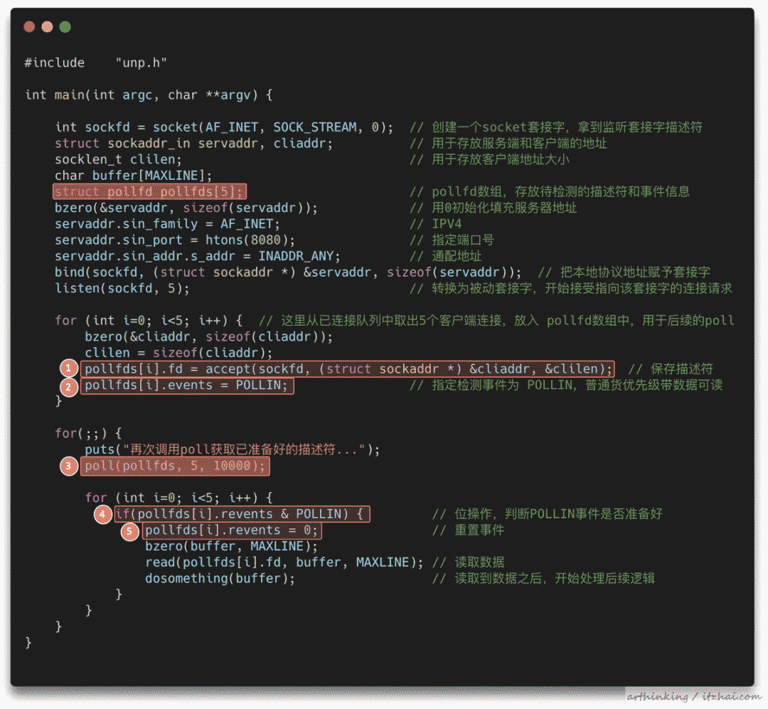 与select的例子很类似,开启了一个监听套接字,然后获取5个客户端连接,通过poll函数判断是否有数据到达服务器端,如果有则读取,我把详细的注释都加上了,下面重点介绍标注了序号的代码: