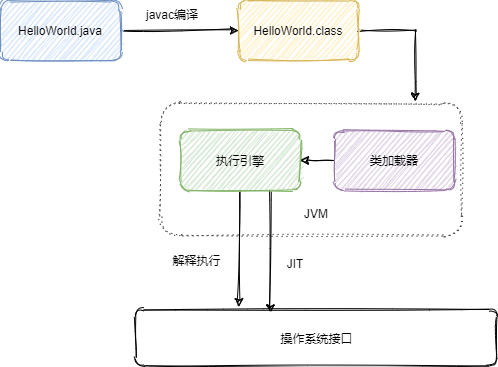 JVM 通过 Java 类加载器加载 javac 编译出来的 class 文件,通过执行引擎解释执行或者 JIT 即时编译调用才调用系统接口实现程序的运行。
