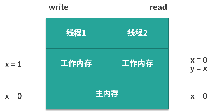 线程 1 修改了 a 的值,但是修改后没有来得及把新结果写回主存或者线程 2 没来得及读到最新的值,所以线程 2 看不到刚才线程 1 对 a 的修改,此时线程 2 看到的 a 还是等于初始值。但是线程 2 却可能看到线程 1 修改 a 之后的代码执行效果,表面上看起来像是发生了重顺序。