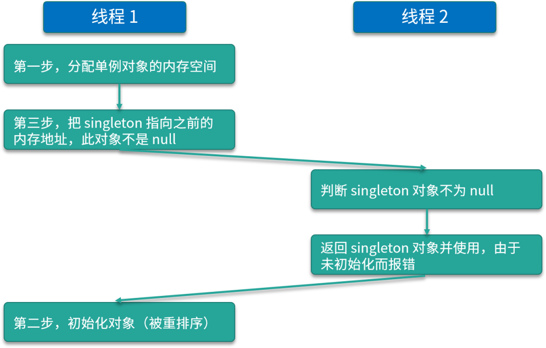 这种重排序可能就会导致一个线程拿到的 instance 是非空的但是还没初始化完全。