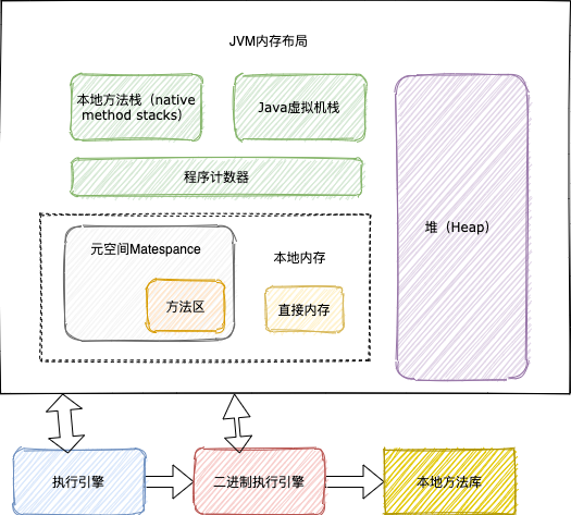 执行字节码的模块叫做执行引擎,执行引擎依靠程序计数器恢复线程切换。本地内存包含元数据区域以及一些直接内存。
