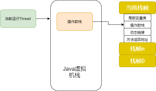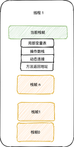 每个线程拥有一个「虚拟机栈」,每个「虚拟机栈」拥有多个「栈帧」,而栈帧则对应着一个方法。每个「栈帧」包含局部变量表、操作数栈、动态链接、方法返回地址。方法运行结束则意味着该「栈帧」出栈。