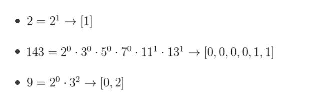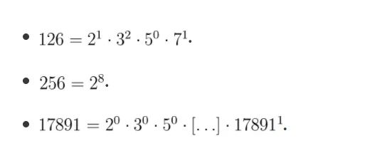一个数字可以通过其质因子(prime factors )的指数列表来唯一标识(直到其最高位的非零指数)。所以,我们可以用 126 来表示列表[1, 2, 0, 1] 。列表中的第一个数字是 126 作质数分解后 2 的指数,第二个数是 3 的指数,依此类推。
