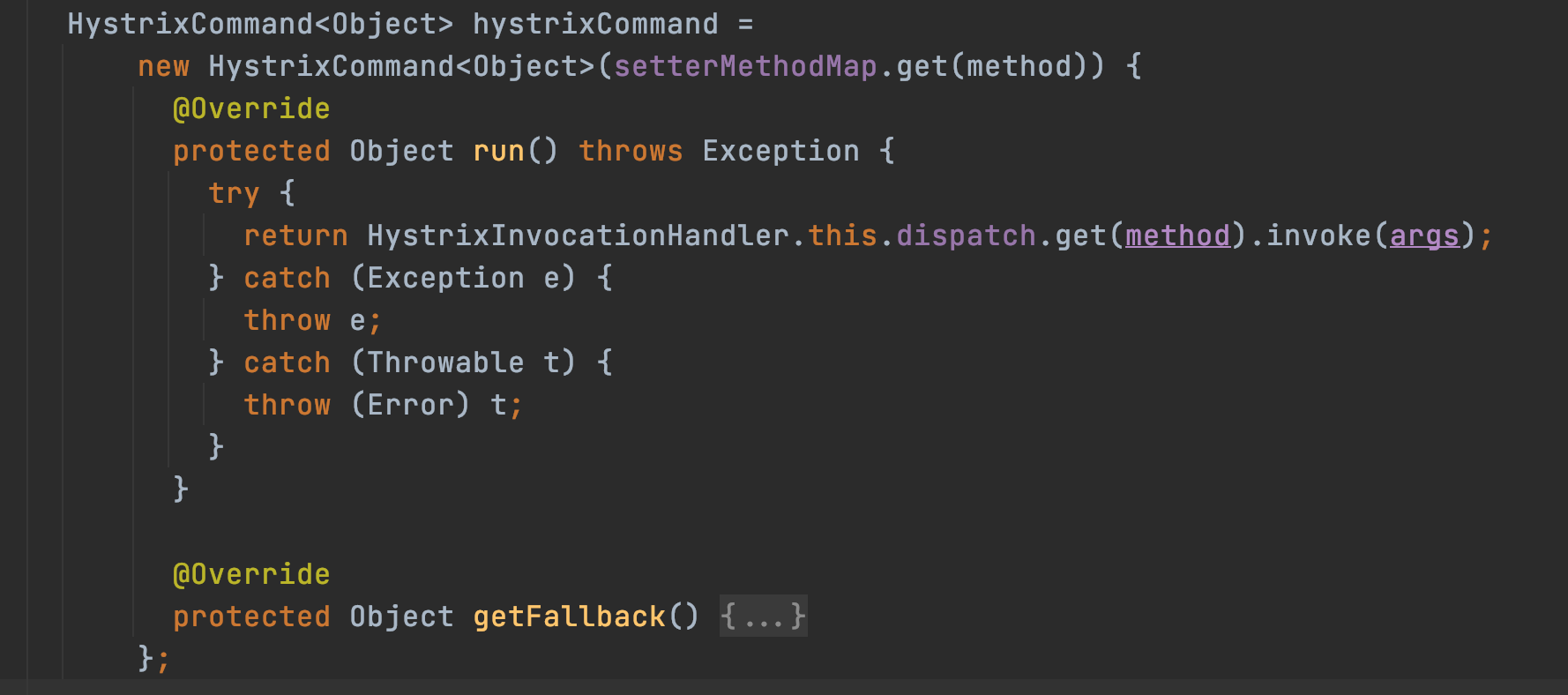 - HystrixInvocationHandler:这是一个实现了JDK代理接口类,用来代理Feign最终的执行,HystrixCommand类就是在这个实例里被构造执行的,使用的构造方法正是带入参Setter的构造方法,集成方会实现SetterFactory来构造Setter。调试程序时我们将端点打进这个类里,就可以看到配置加载的情况