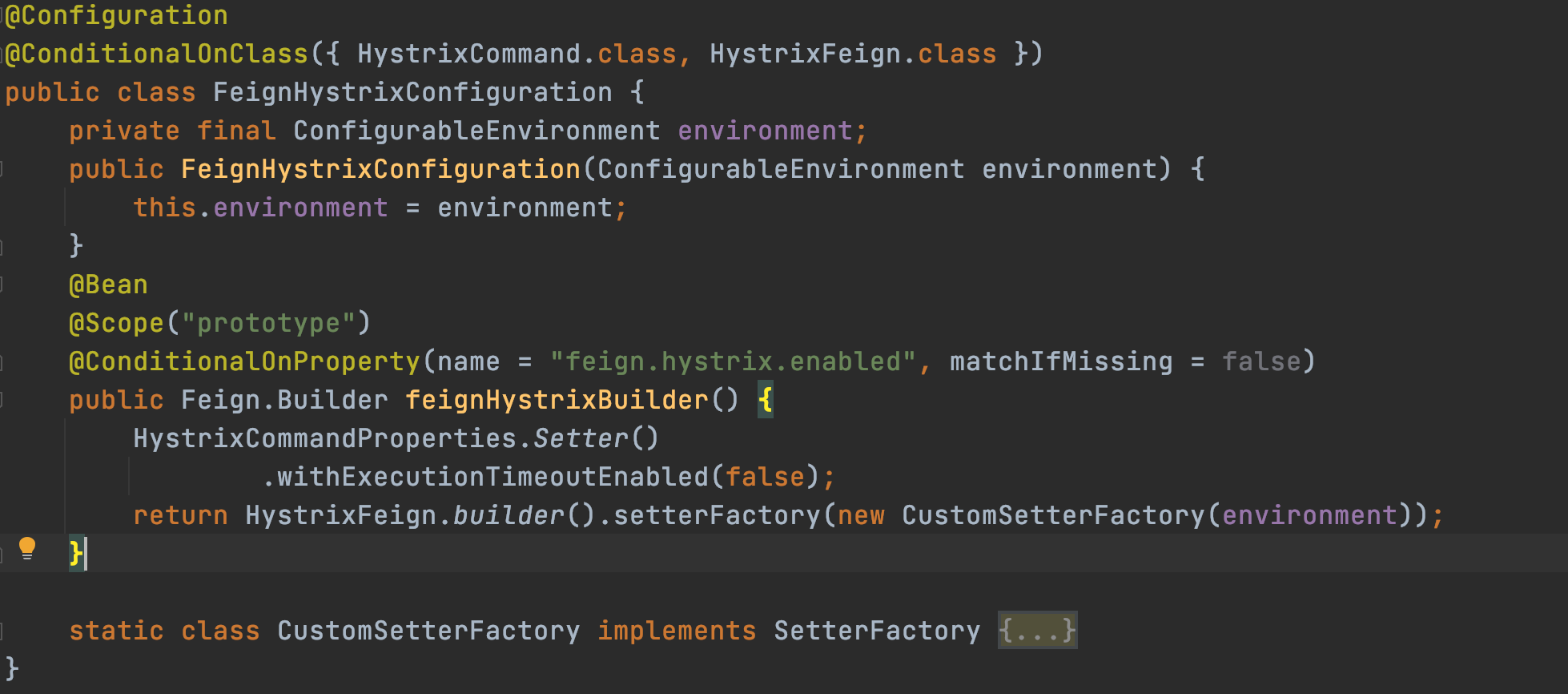 } 这里是Hystrix在feign框架下加载的总入口。这个默认的构建器Builder中,有一个默认实现的SetterFactory,这个SetterFactory专门负责传递参数给Hystrix初始化HystrixCommand用。可以看到这里Bean的实例化加上了@ConditionalOnMissingBean条件约束,既我们可以自定义实现Hystrix的构造器,覆盖这里的实现,在自定义的构造器中,可以通过自定义实现SetterFactory,来注入任意的配置。这个是实现Hystrix配置自定义加载的方式之一,不过不推荐,没必要破坏spirng现有的这种结构,而且代码也会比较冗长(下面{...}省略了一百多行配置处理代码,用来兼容Hystrix现有配置定义),看起来如下: