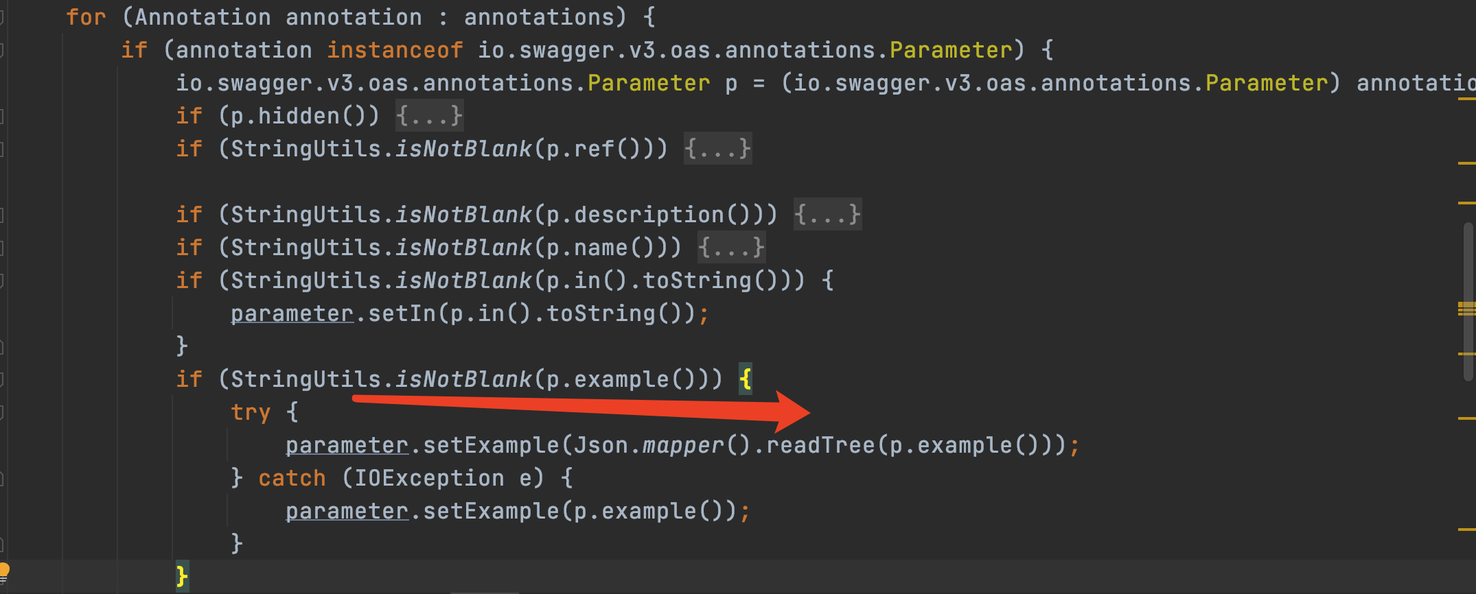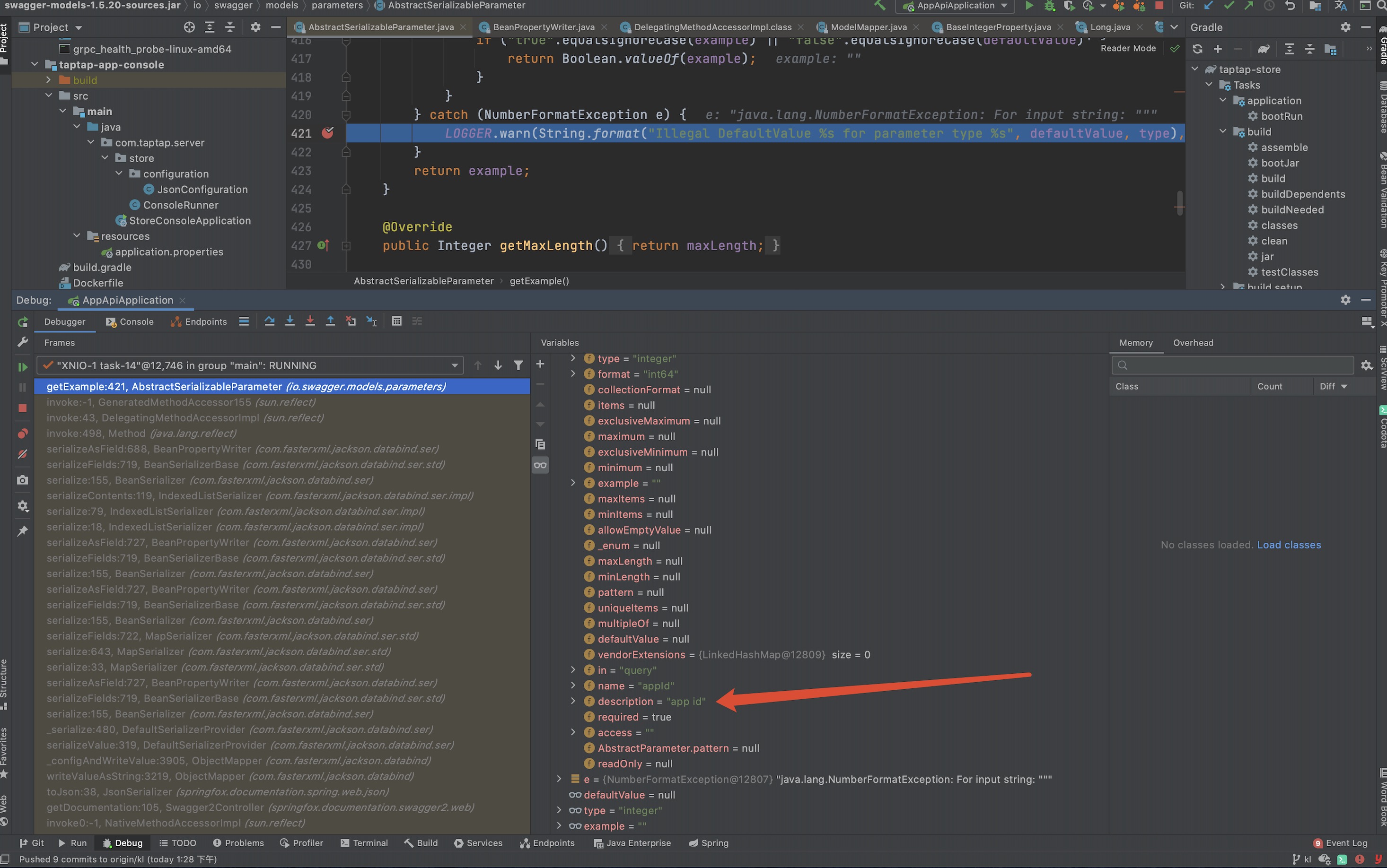 } 如上是异常相关的代码。从异常信息表象来看,是一个强转导致的问题,代码试图将一个空的字符串转换成数值类型导致异常抛出。并且是getExample时抛出的异常,这里需要了解swagger ui的加载过程和基础架构才能直接定位。swagger中的example是为了在生成的api doc中,给出相关字段的调用示例,并在触发接口调用时,默认自动填充example的值。这里显然是哪个地方的example设置不合理导致的异常。那么,接下来要做的就是找到这个空字符串的原始代码。