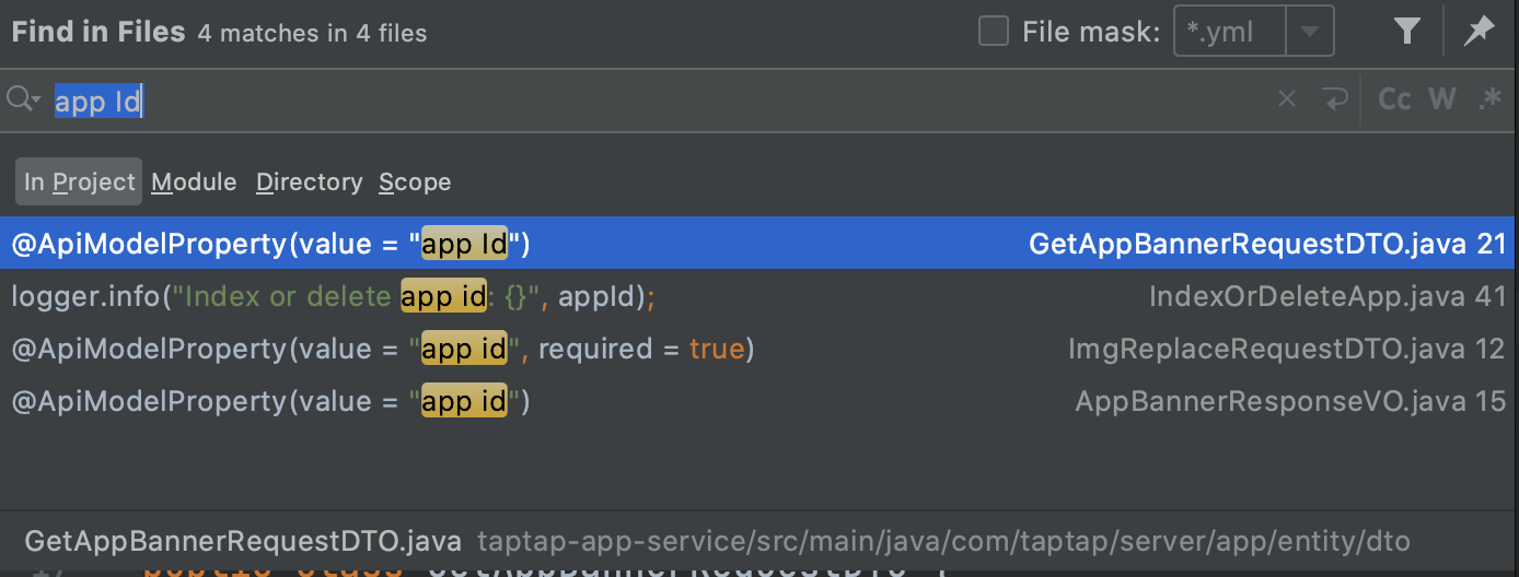 有三个相关的Model实体,首先,这三个Model的appId字段都没有设置过example属性,所以,到这一步,可以先下一个小的结论,不是我们设置的example导致的问题,默认在不设置的情况下,example的默认值就是空字符串。然后肯定只有其中一个有问题,因为异常只会触发一次。在不知道结果情况下,依次对这三个Model的appId字段加上正确的example描述,经测试,只有GetAppBannerRequestDTO加上时,异常才消失,罪魁祸首就是它了。但是,为什么呢?其他两个Model为啥就没有问题呢?在博主交叉测验后,发现了最终的原因。