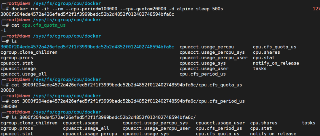 下面我们来演示 docker 进行设置的效果,就会在 CPU 子系统的 docker 控制组中进行相关的设置。