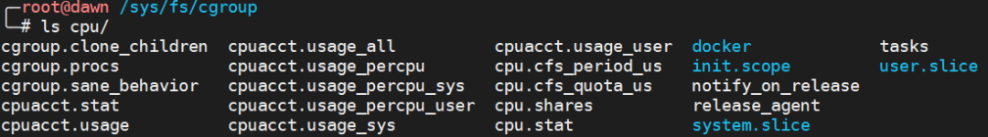 而在子目录下面可以看到该子系统对应的资源可以被限制的方法,比如对于 CPU 子系统来说,我们可以看到如下几个配置文件。