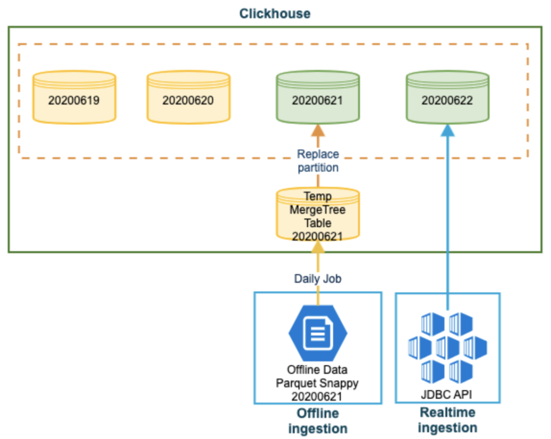 我们也大致上采用了这一架构。但具体的做法和经典有所不同。ClickHouse里数据分区(partition)是一个独立的数据存储单元,每一个分区都可以单独从现有表里脱离(detach)、引入(attach)和替换(replace)。分区的条件可以自定义,一般按照时间划分。通过对数据表内数据分区的单个替换,我们可以做到查询层对底层数据更新的透明,也不需要额外的逻辑进行数据合并。