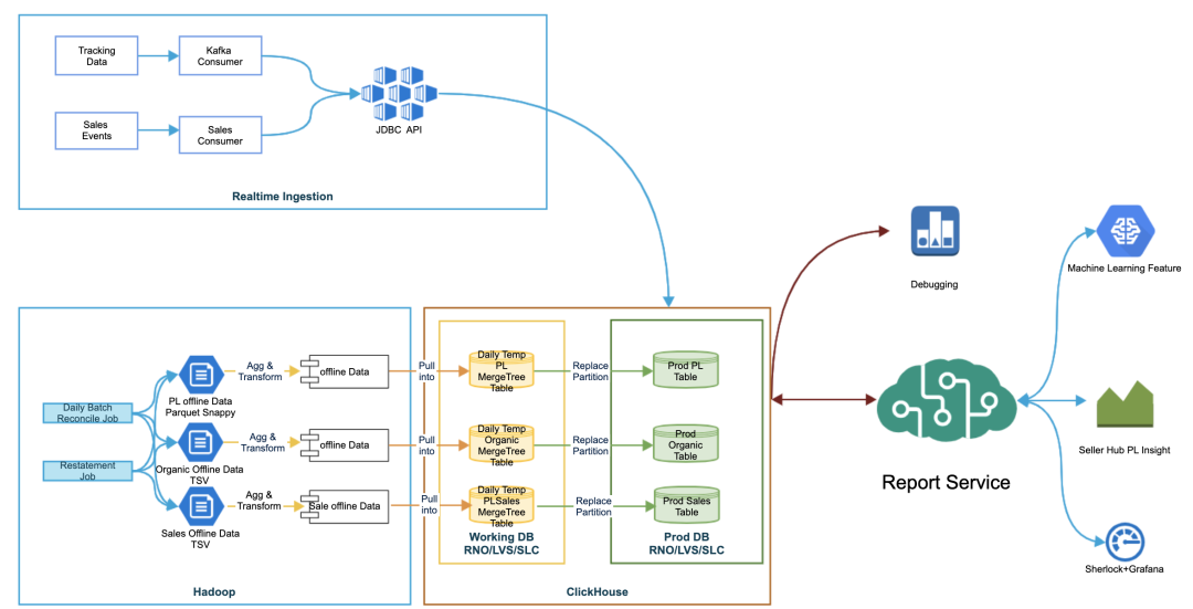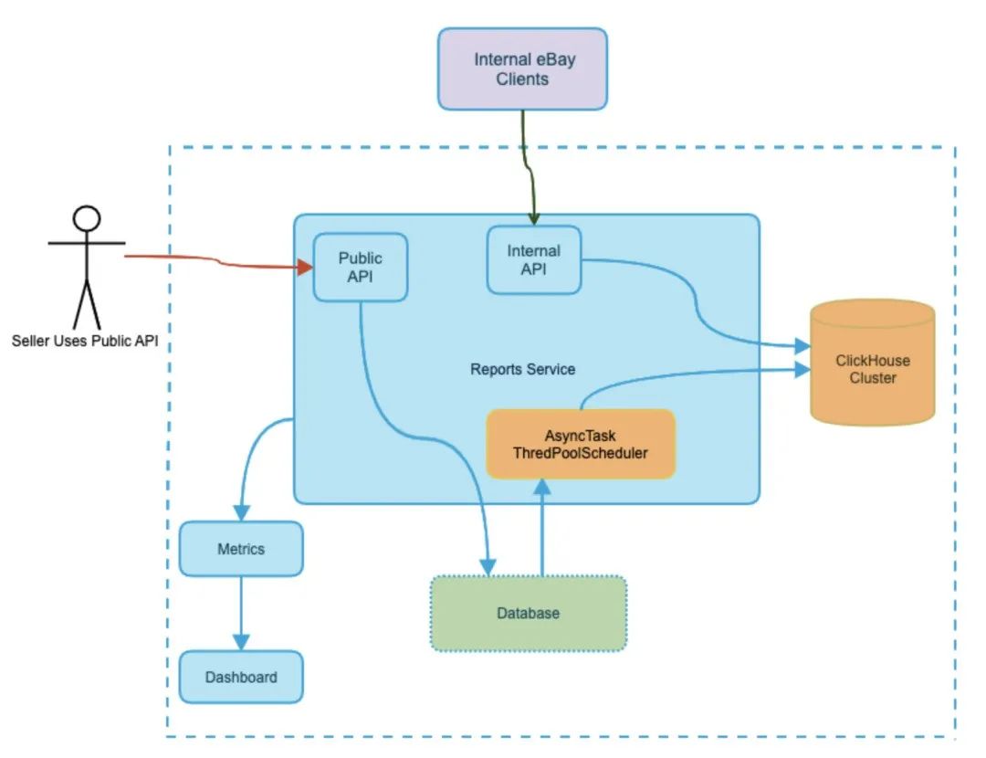Ebay Seller Hub通过Reports Service接入ClickHouse查询,Reports Service提供了Public和Internal两套API。Internal API提供给Seller Hub以及其他内部的已知应用使用,Public API在eBay Developers Program(详情见: https://developer.ebay.com/)开放给第三方开发者。
