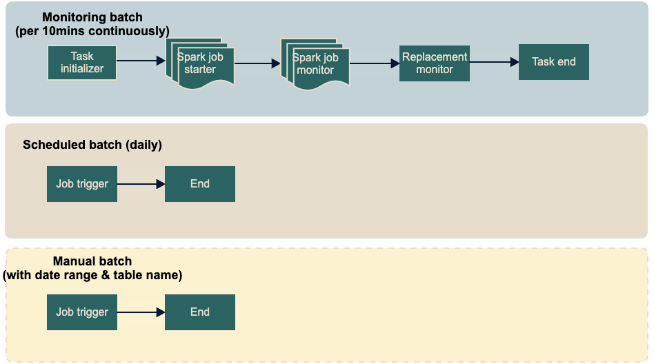 我们利用平台团队封装的Spring Batch管理更新任务,按照日期将每天的数据划分为一个子任务。通过Spring Batch实现的Continuously Job保证在同一时刻子任务在运行的唯一性,避免产生任务竞争问题。对于过往数据的更新,我们将Batch任务分类,除了日常任务之外,还可以手动触发给定时间范围内的数据修正任务(如图2)。