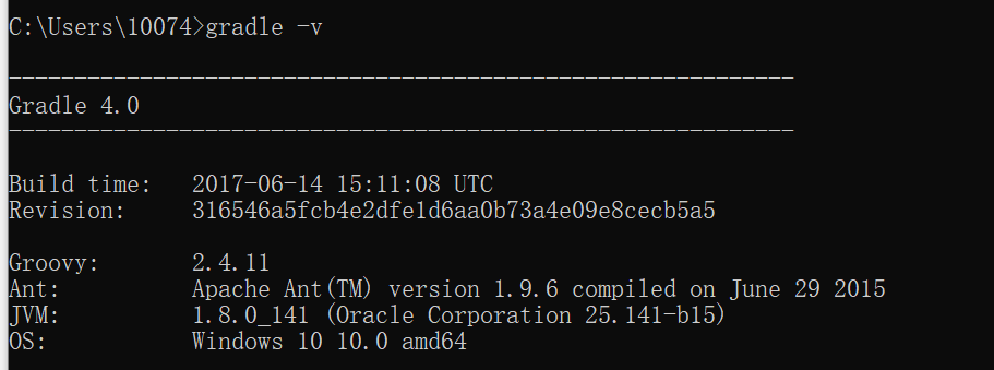 第三步:检测环境,输入 gradle -v 命令,得到以下结果: