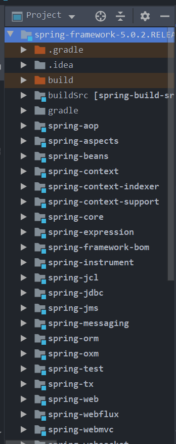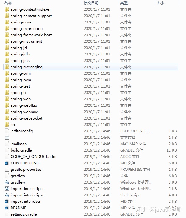 这里不做过多赘述,大家可自行去 github 网站下载,我们使用的版本下载链接为: https://github.com/spring-projects/spring-framework/archive/v5.0.2.RELEASE.zip,下载完成后,解压源码包会看到以下文件目录: