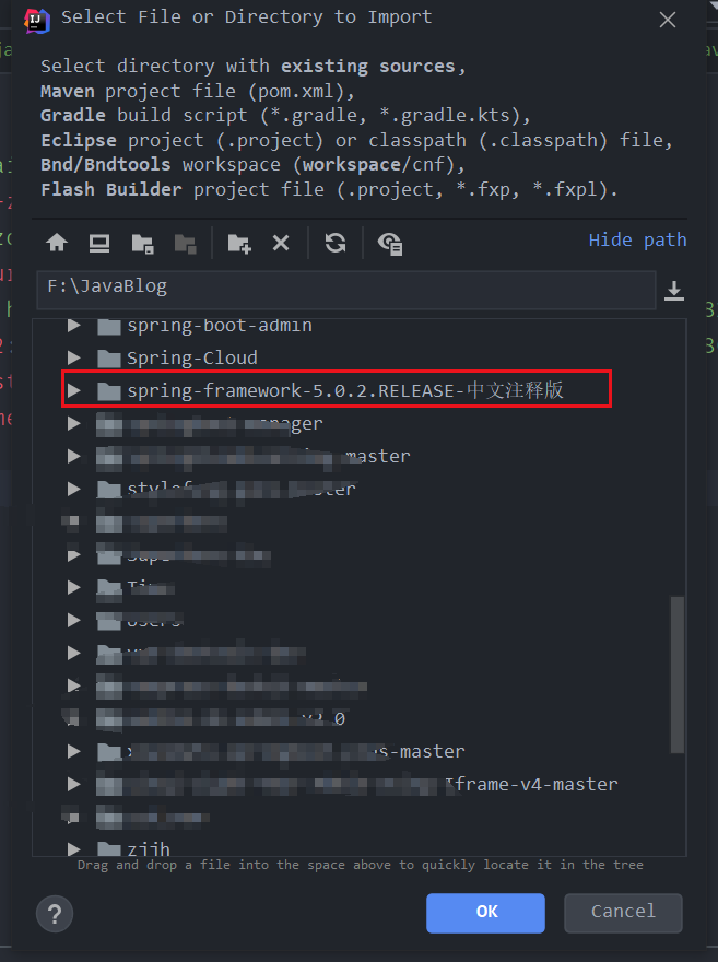 第七步:导入 IDEA。打开 IntelliJ IDEA,点击 Import Project,弹出如下界面,选择spring-framework-5.0.2.RELEASE 文件夹