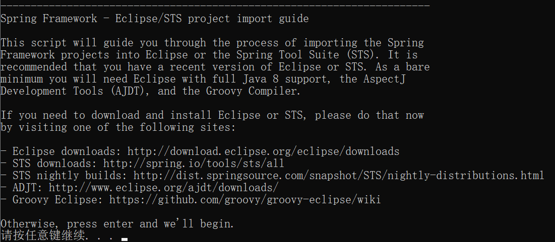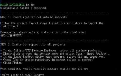第五步:转换为 eclipse 项目,执行 import-into-eclipse.bat 命令,构建前,请确保网络状态良好,按任意键继续。