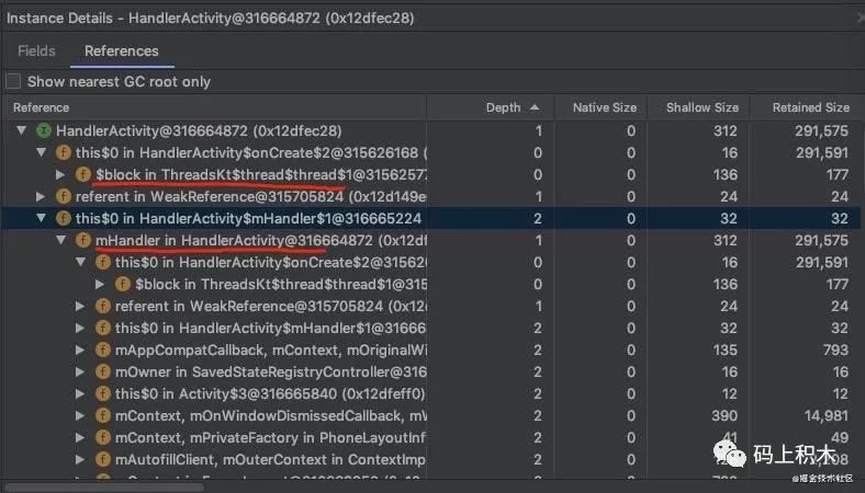 从这张图可以看到,我们的HandlerActivity发生了内存泄漏,从引用路径来看,是被匿名内部类的实例mHandler持有引用了,而Handler的引用是被Message持有了,Message引用是被MessageQueue持有了...