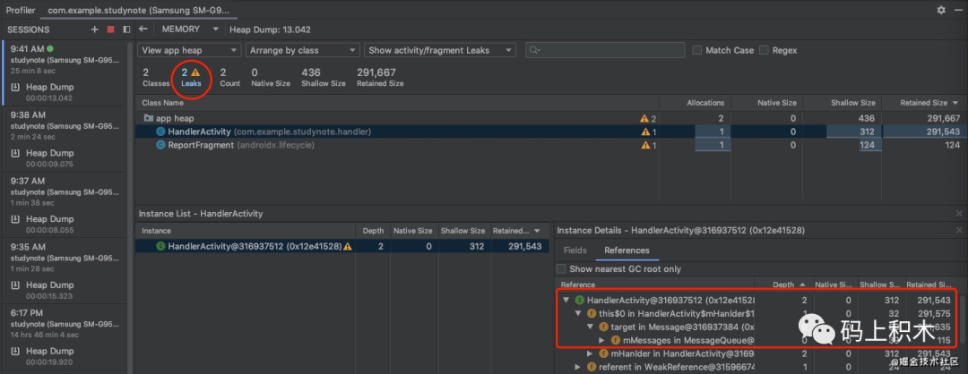 现在查看内存泄漏还是蛮方便的了,AndroidStudio自带对堆转储(Heap Dump)文件进行分析,并且会把内存泄漏点明确标出来。
