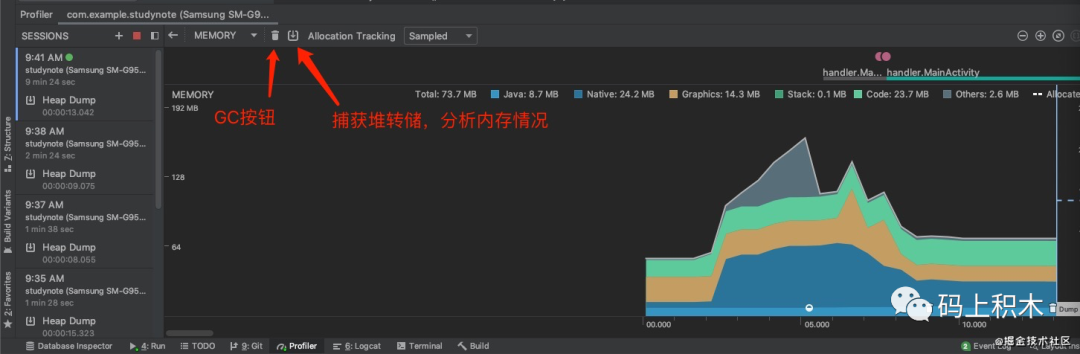 捕获堆转储文件按钮,也就是生成hprof文件,这个文件会展示Java堆的使用情况,点击这个按钮后,AndroidStudio会帮我们生成这个堆转储文件并且进行分析。 -