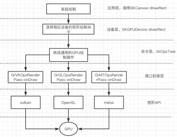 Skia对上述三种图形接口进行了封装,屏蔽了不同底层图形API接口的差异。OpenGL接口的封为GrGLOpsRenderPass,Metal的封装层为GrMTOpsRenderPass,Vuklan的封装层为 GrVKOpsRenderPass。